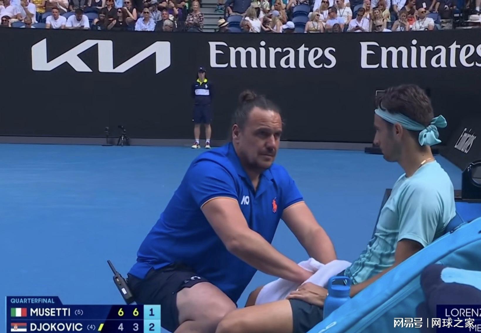 今天下午,2026年澳大利亚网球公开赛男单四分之一决赛现场,戏剧性的一幕让罗德拉沃尔球场的观众席陷入一片复杂的寂静中。意大利选手洛伦佐·穆塞蒂在盘分2-0领先、第三盘1-3落后的情况下,因意外受伤被迫退赛,将德约科维奇送入了他的第13个澳网半决赛。